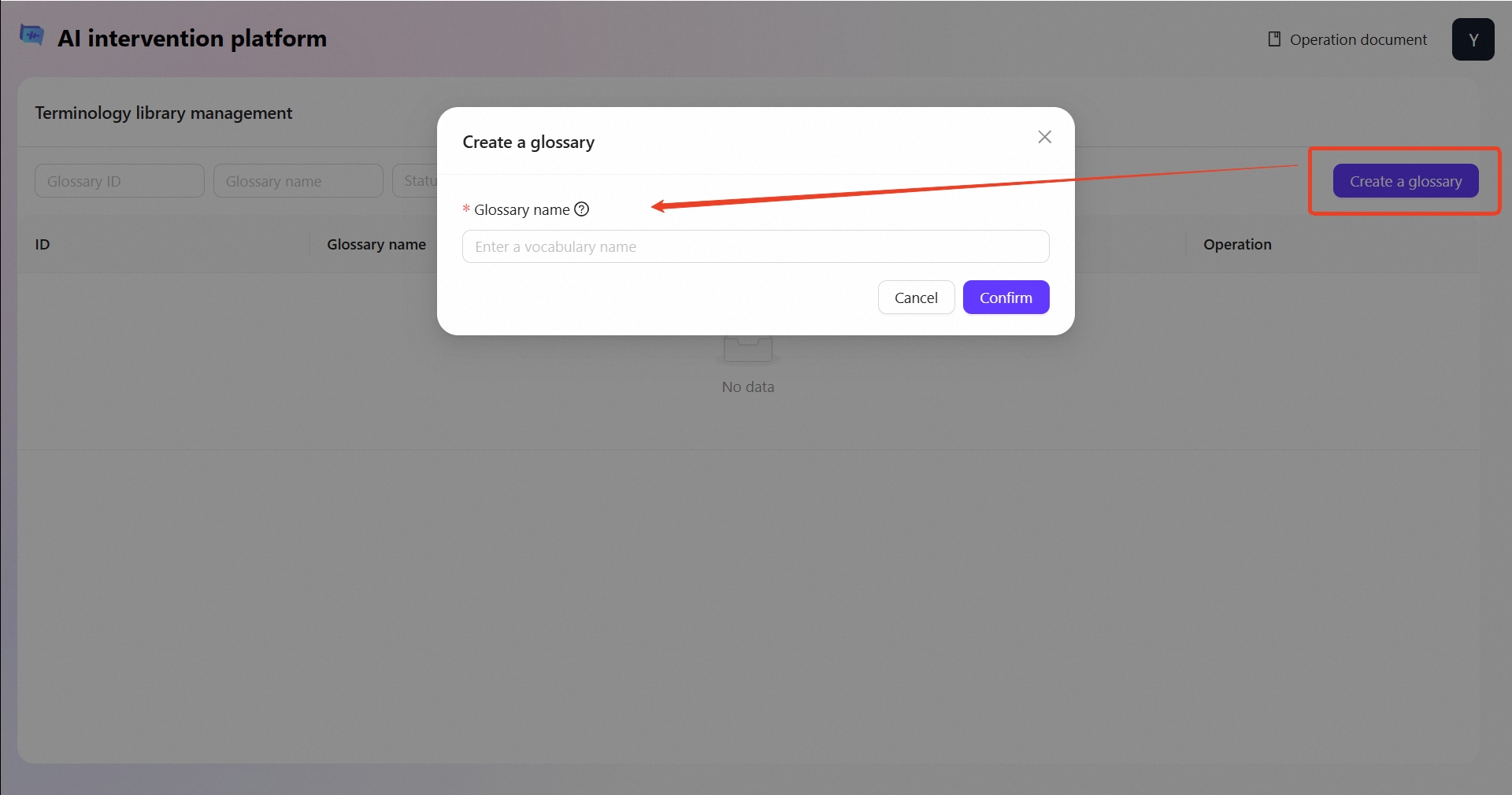 On the Terminology library management page, click "Create a glossary". After entering the glossary name, click "Confirm" to create a new glossary.
