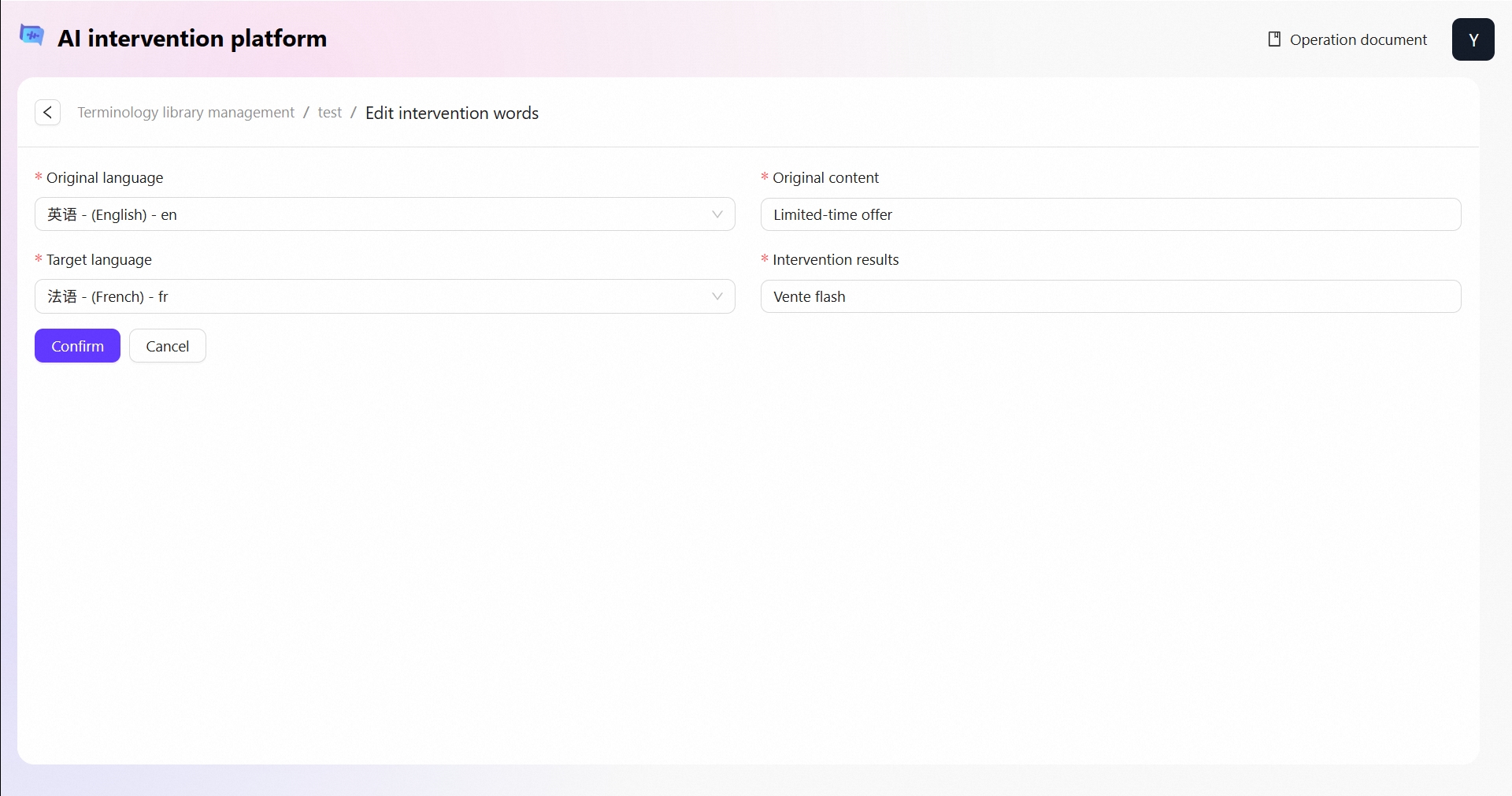Since overly short intervention terms (such as single letters or characters) may introduce risks, fuzzy matching could affect translation results. Please pay attention to the boundaries of intervention capability when configuring intervention terms and be aware of potential risks. If abnormal intervention results occur, promptly remove or deactivate the related intervention terms.