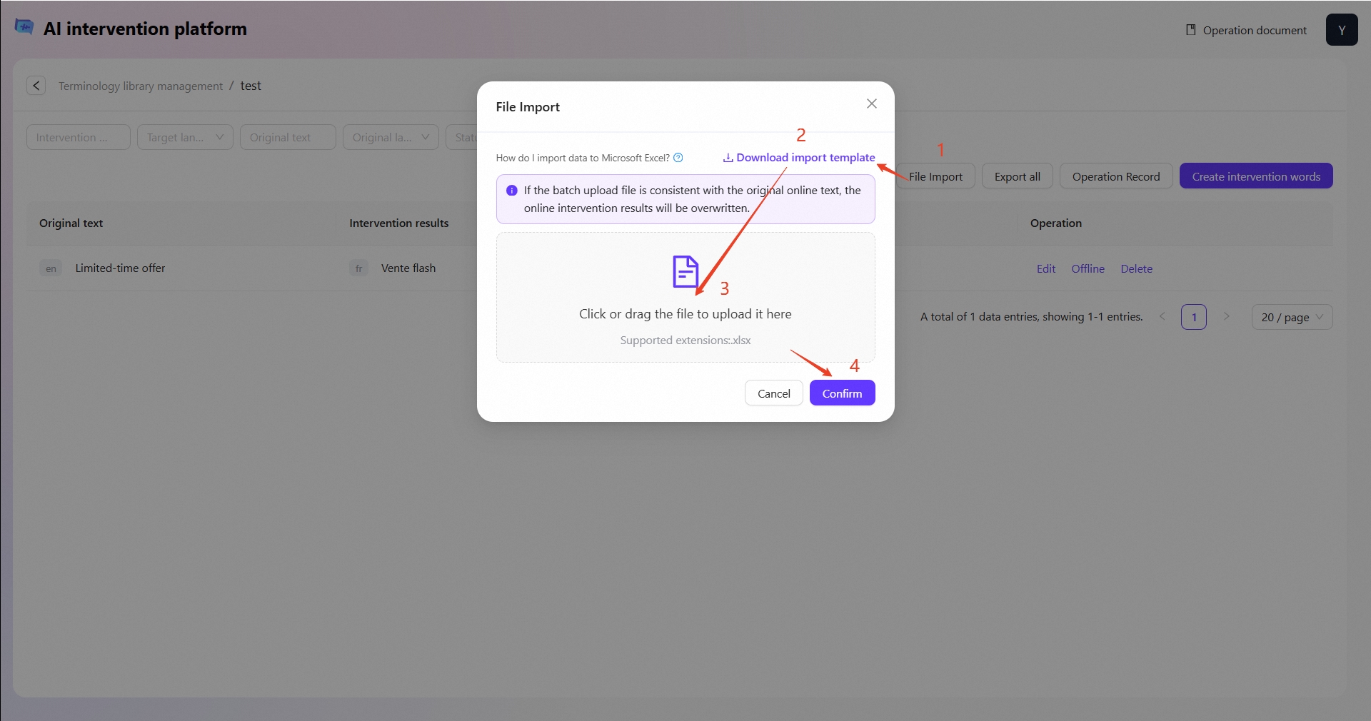 Before uploading, deduplicate intervention data to ensure there is no duplicate information. (Duplicate information refers to intervention terms with the same GlossaryID, source language, target language, and source text, but different intervention result texts.)