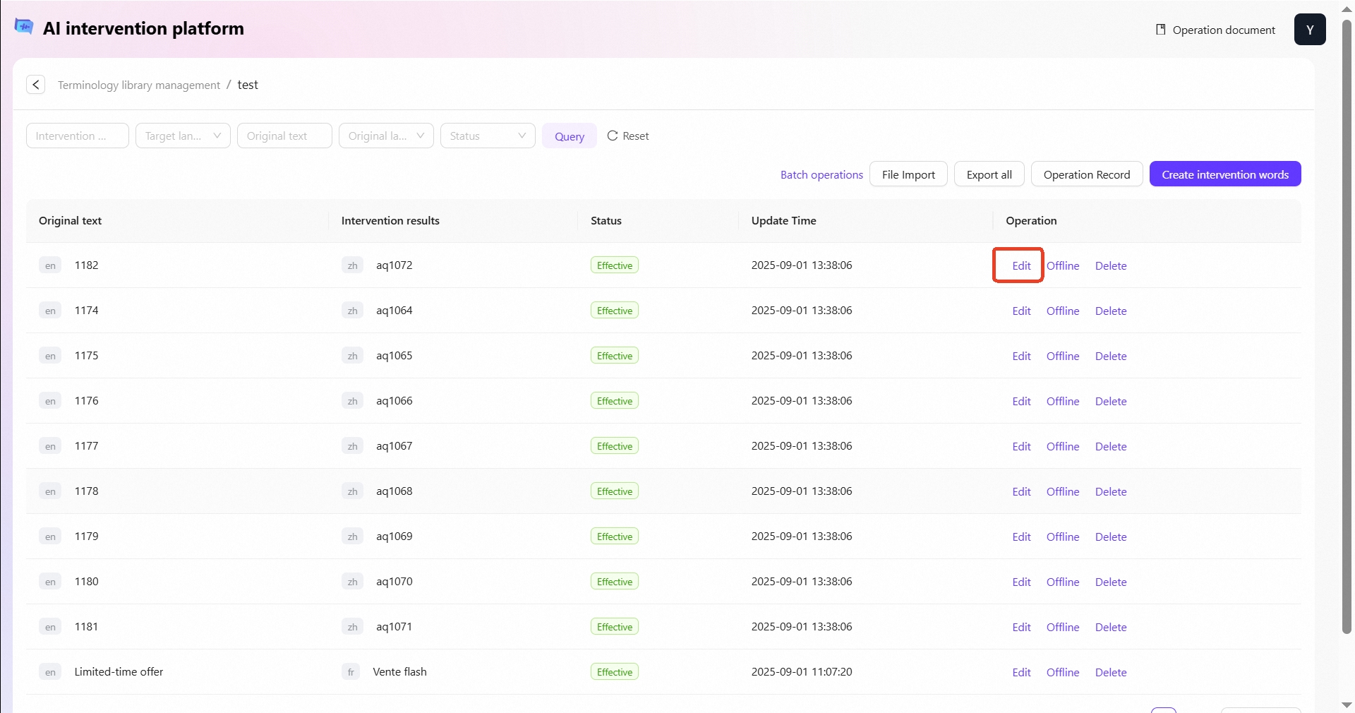 After uploading, you can view the import records and status in the "Operation Record" section. You can also use "Operation Record" to batch deactivate, activate, or download all intervention terms in the file.